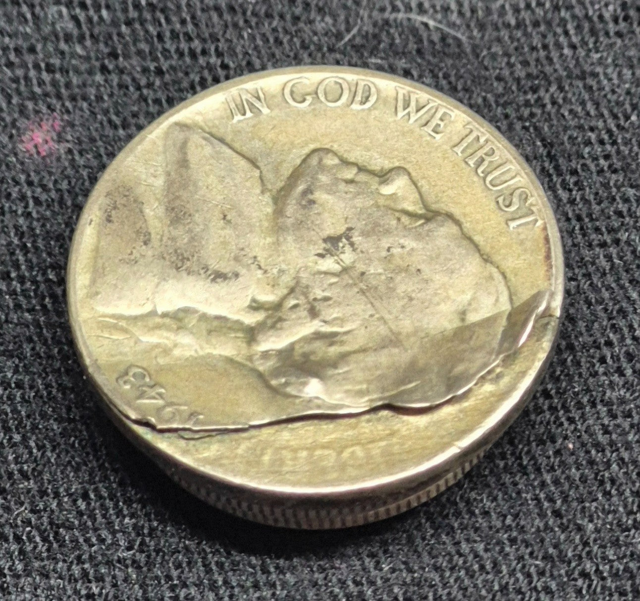 💰1943-P Jefferson War Nickel Error, Major Retained Delamination Obverse Fine 5C
