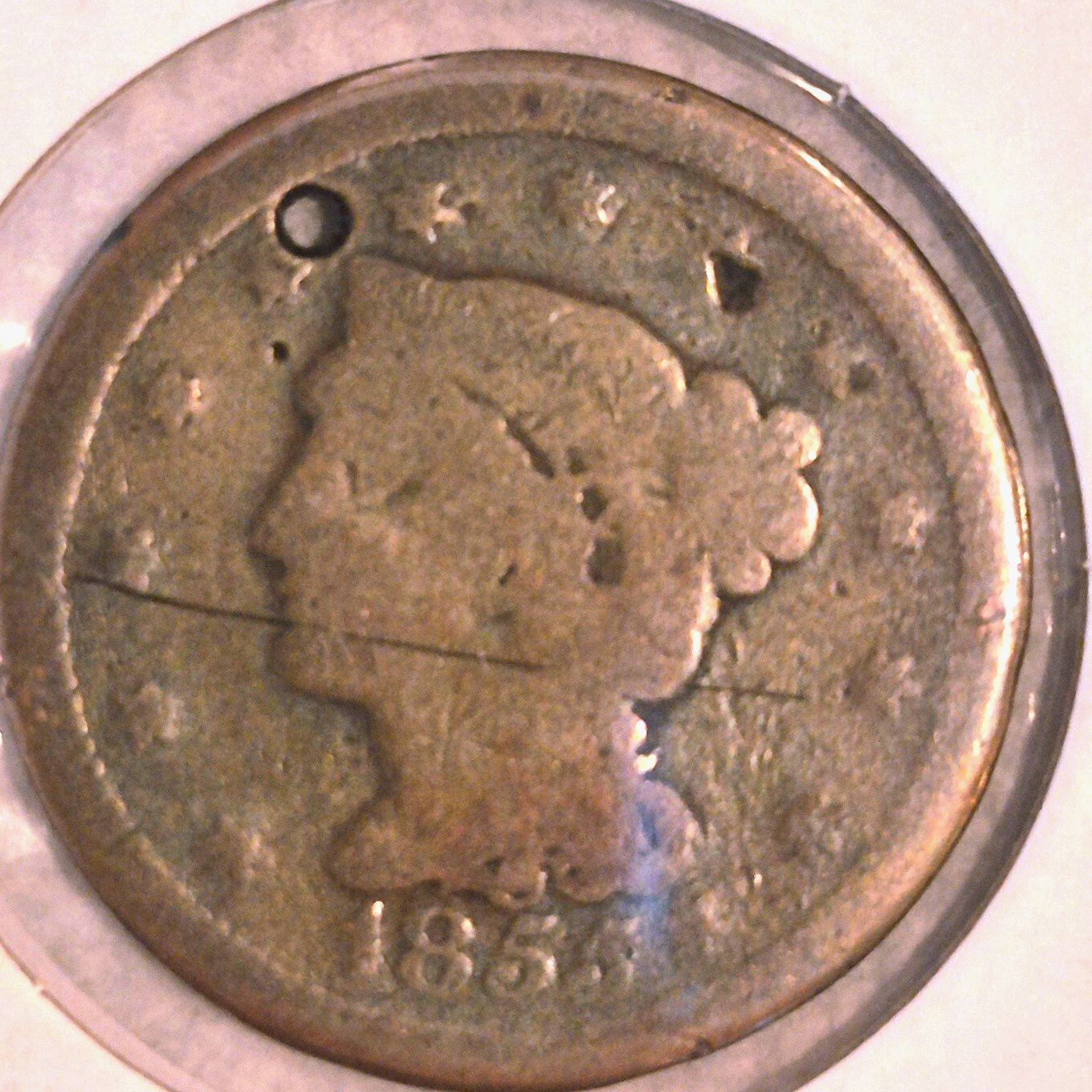 1855 Braided Hair Large Cent Slant 5's Variety AG or Less Jewlery Hole