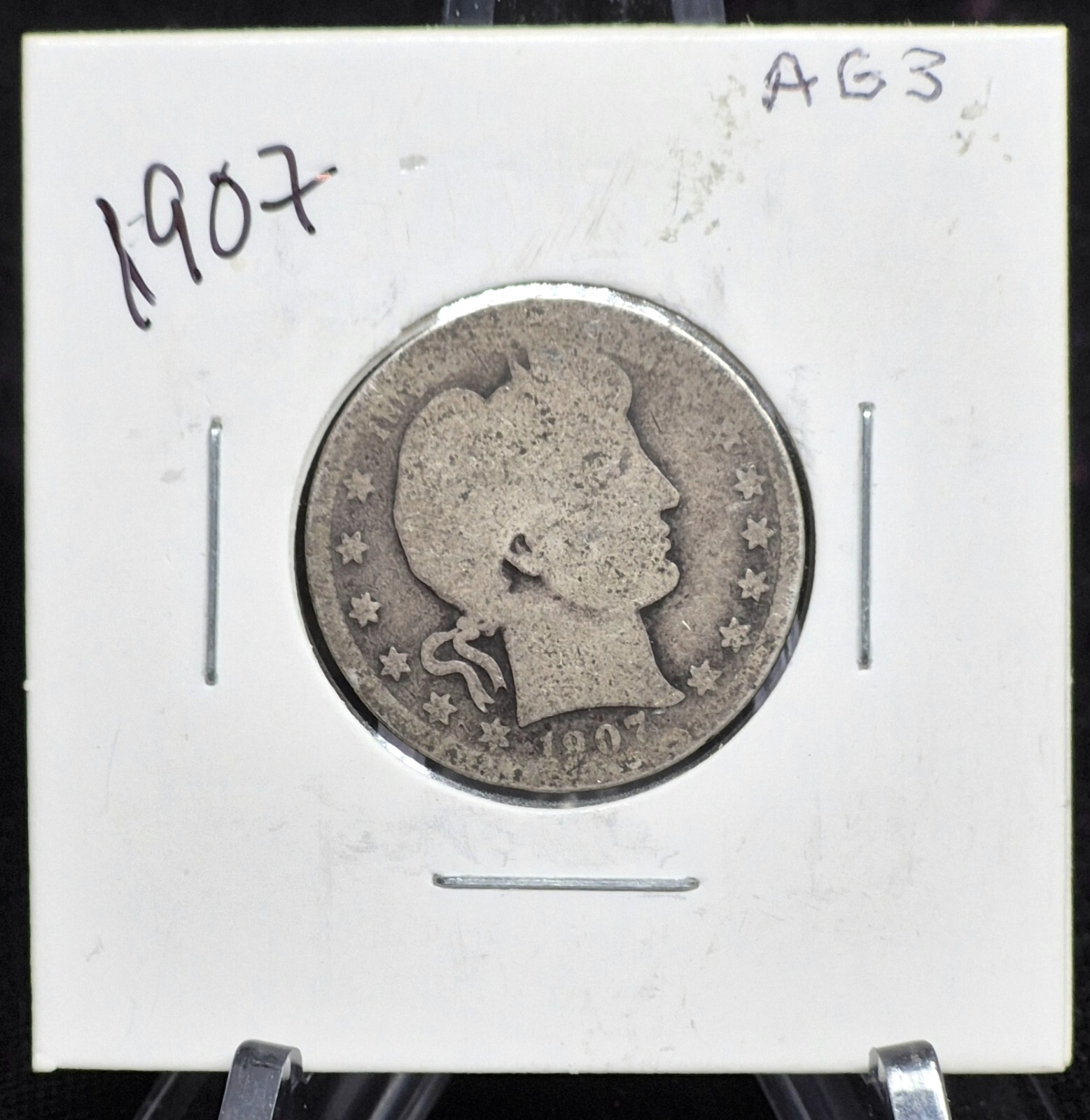 1907 Barber Silver Quarter 90% SILVER Coin Raw Circulated AG Condition or Less