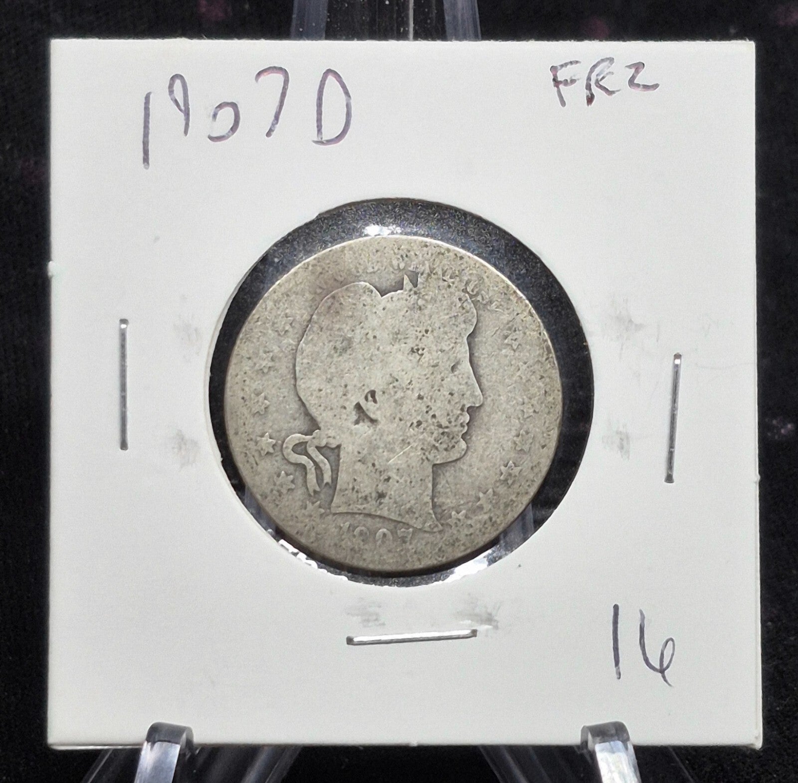 1907 D Barber Silver Quarter 90% SILVER Coin Raw Circulated FR or Less Condition