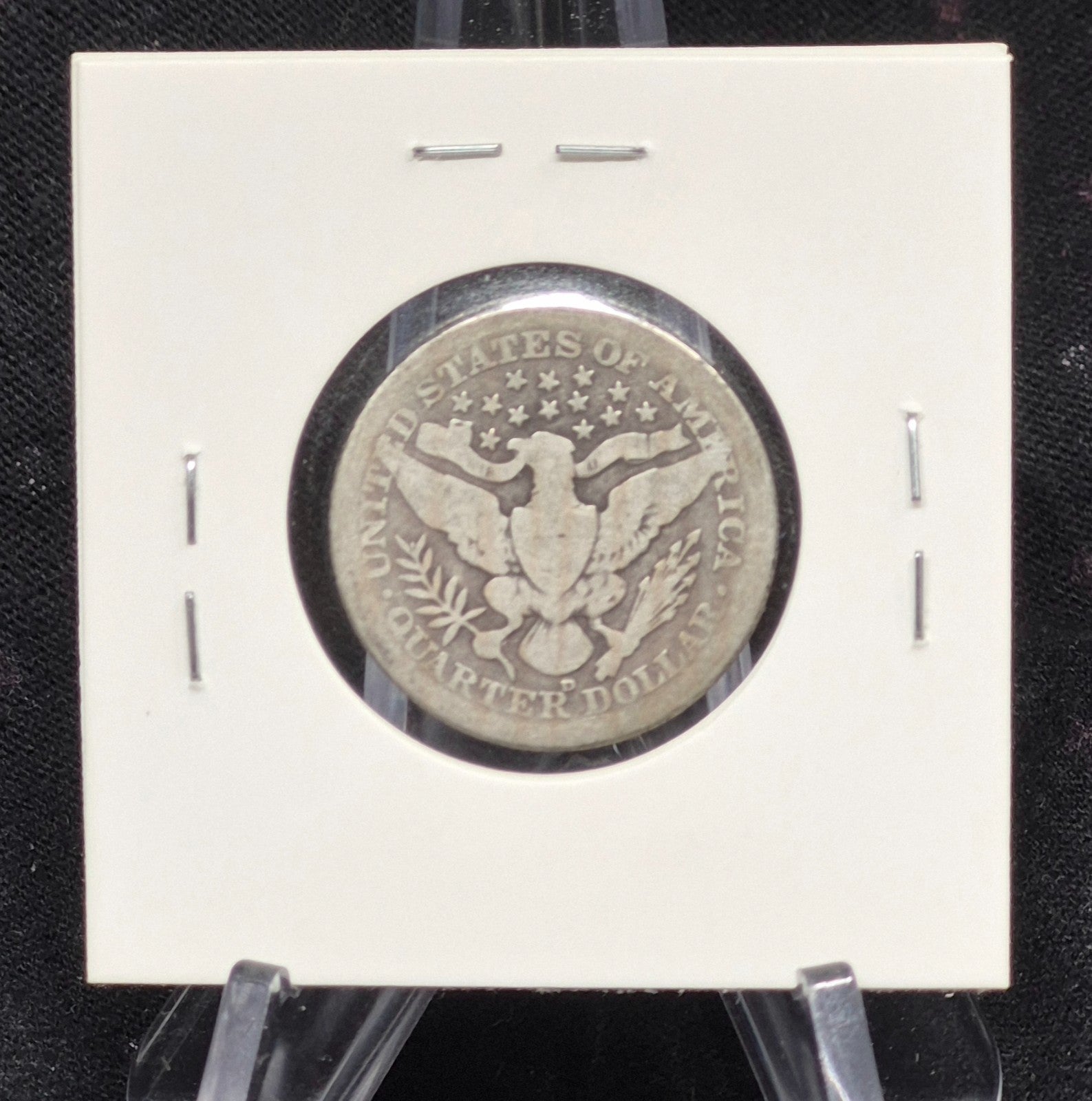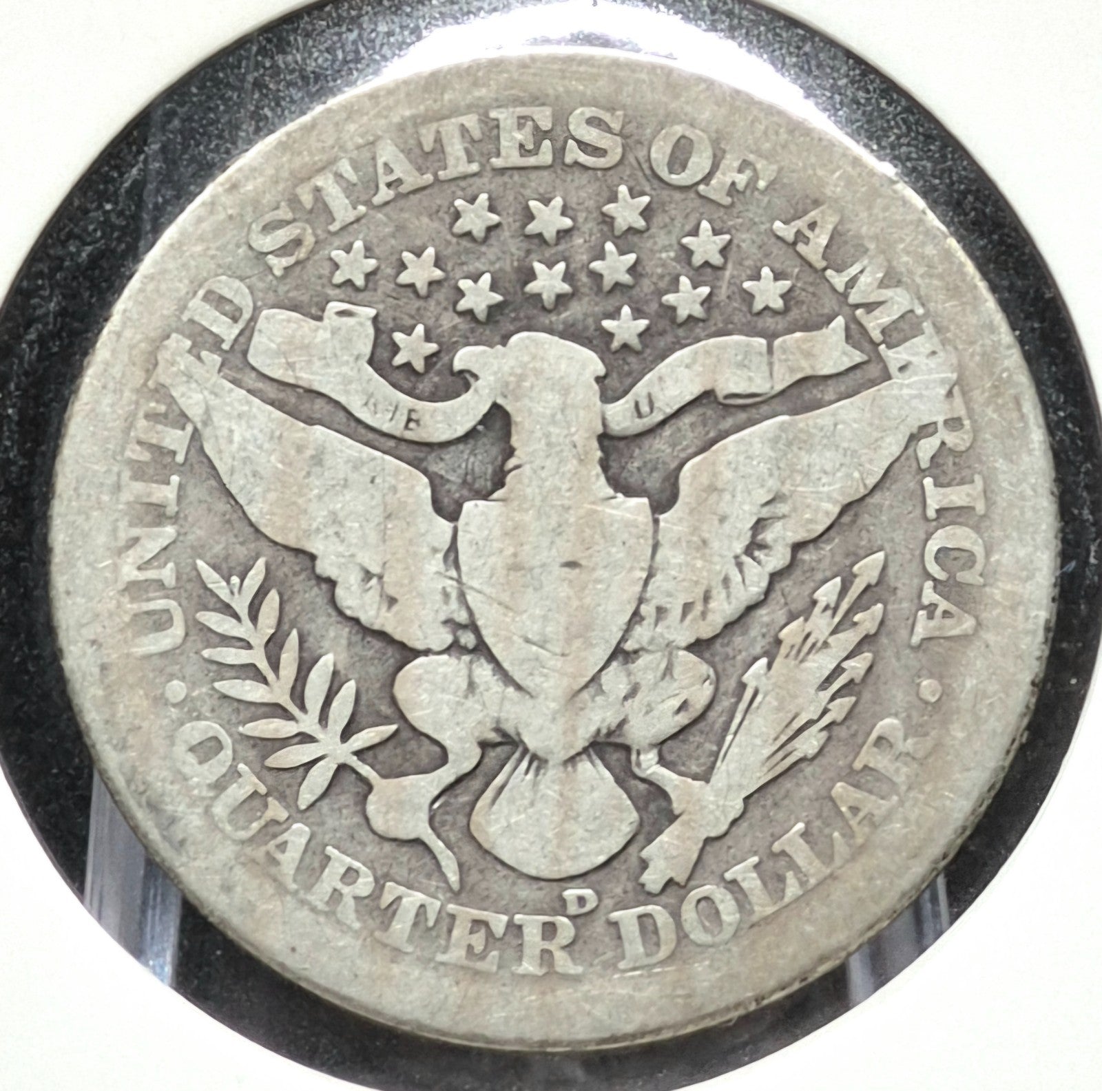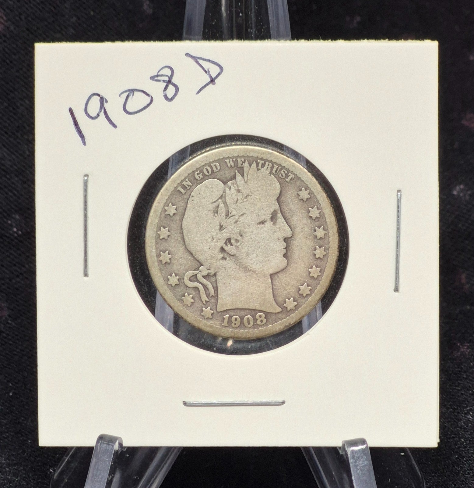 1908 D Barber Silver Quarter 🥈90% SILVER Coin Very Good Condition Partial Motto