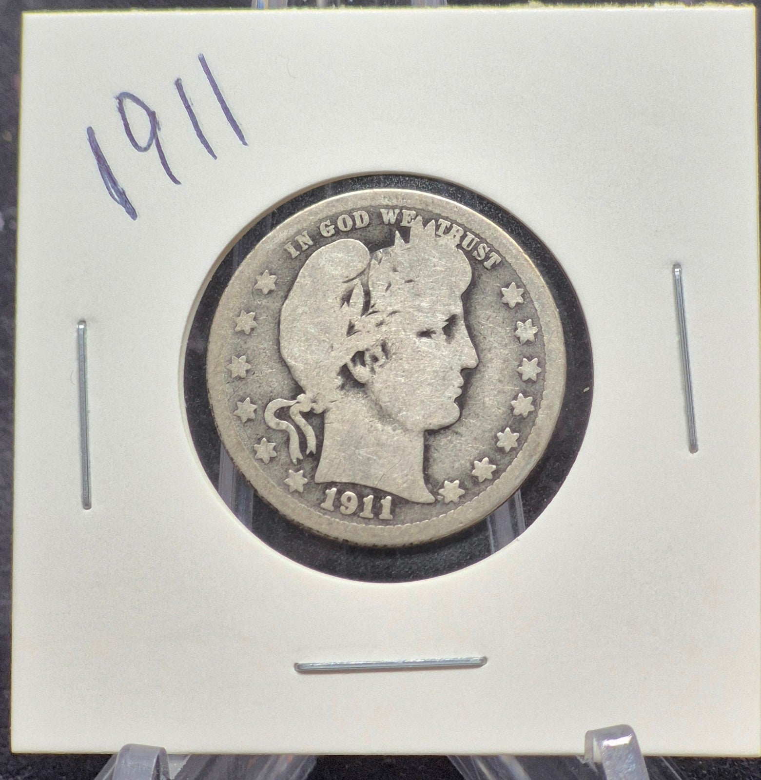1911 Barber Silver Quarter 🥈90% SILVER Coin Very Good Condition Partial Motto