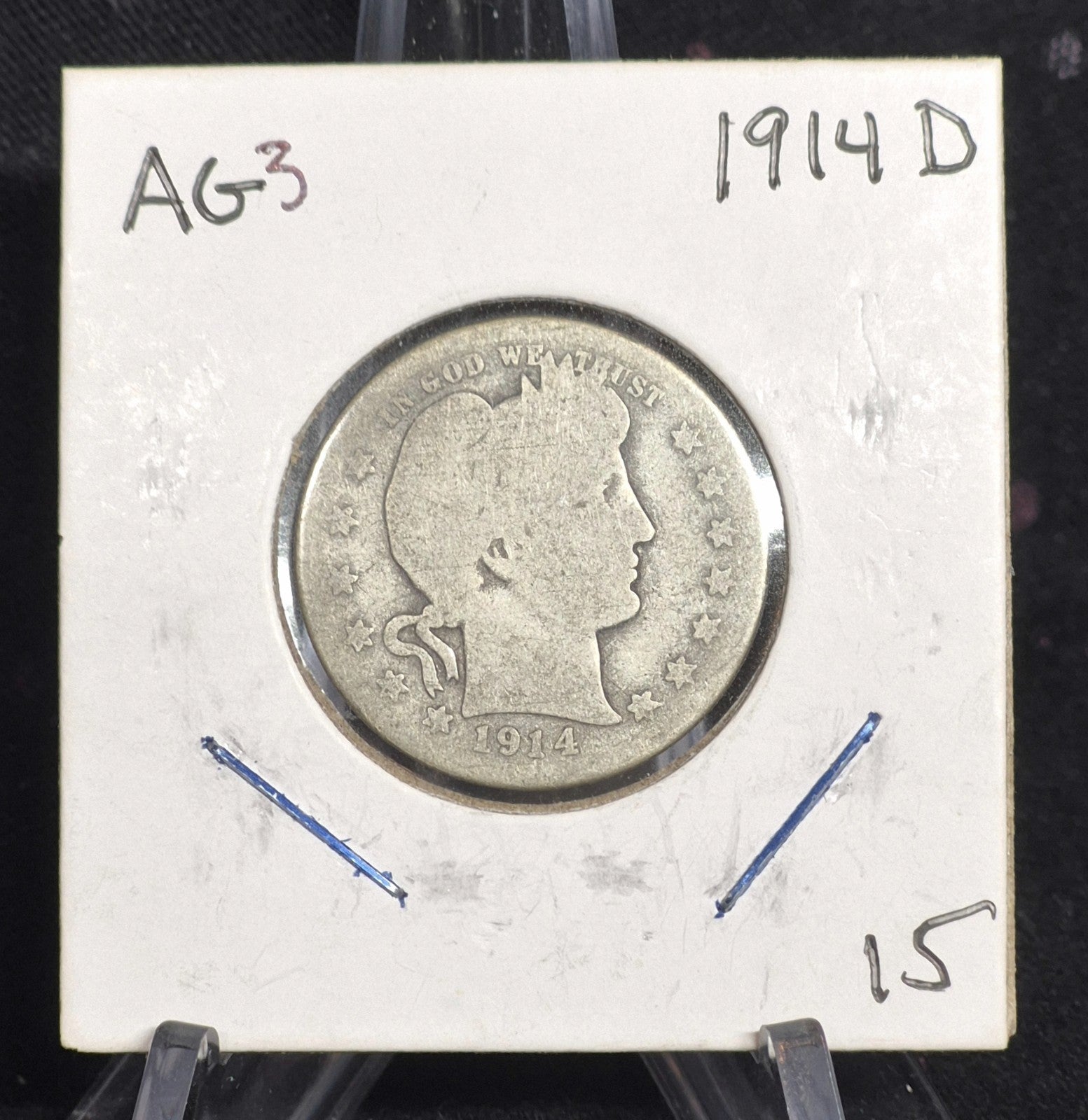 1914 D Barber Silver Quarter 90 % SILVER About Good Condition Partial Motto