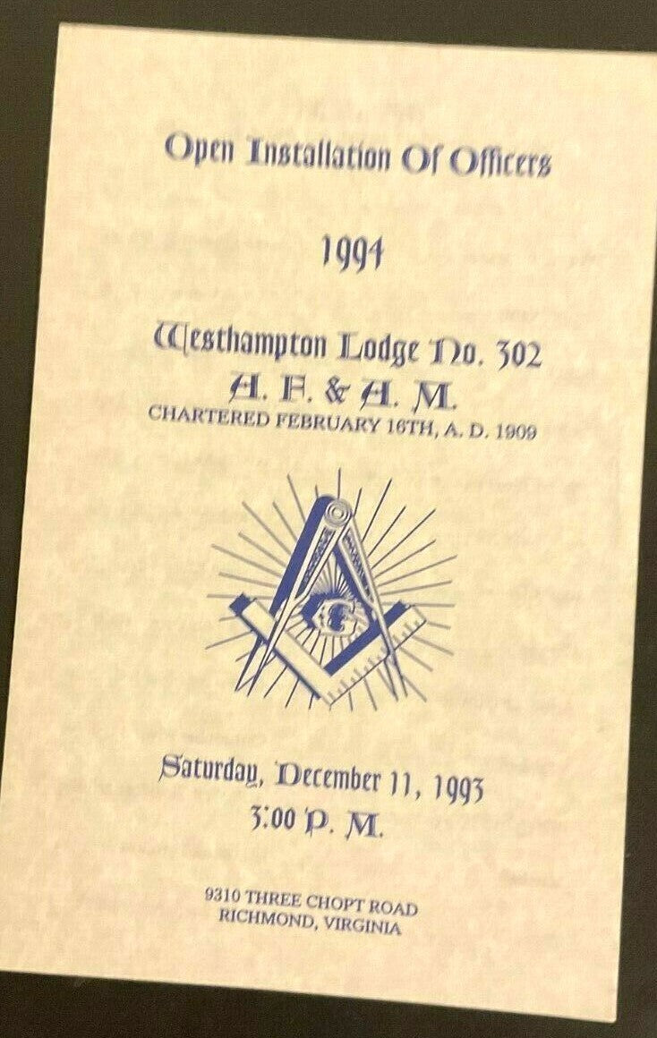 Bonus Items - Program from 1994 Open Installation of Officers, Westhampton Lodge No. 302, A. F. & A. M., Chartered February 16th, A.D. 1909 PLUS a paper napkin from the event that is gold embossed with Masonic emblem and lodge name.