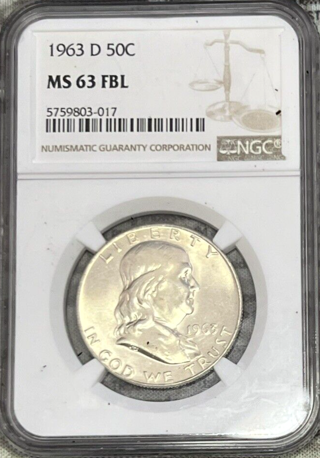 1963 D NGC MS63 FBL Ben Franklin Half Dollar 50c 90% SILVER Strong Strike LInes