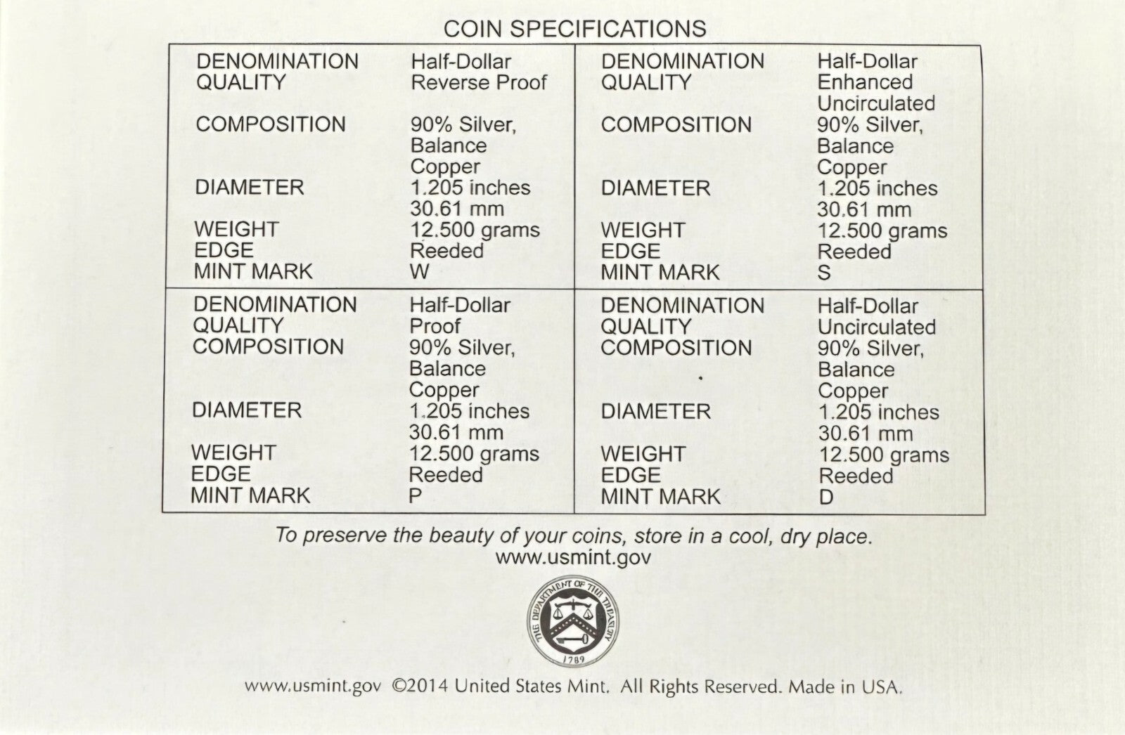 Mint Issued 2014 50th Anniversary Kennedy Half Dollar Silver Coin Collection 4 Piece Set in OGP, (Original Government Packaging), Complete Paperwork, Including CoA (Certificate of Authenticity)